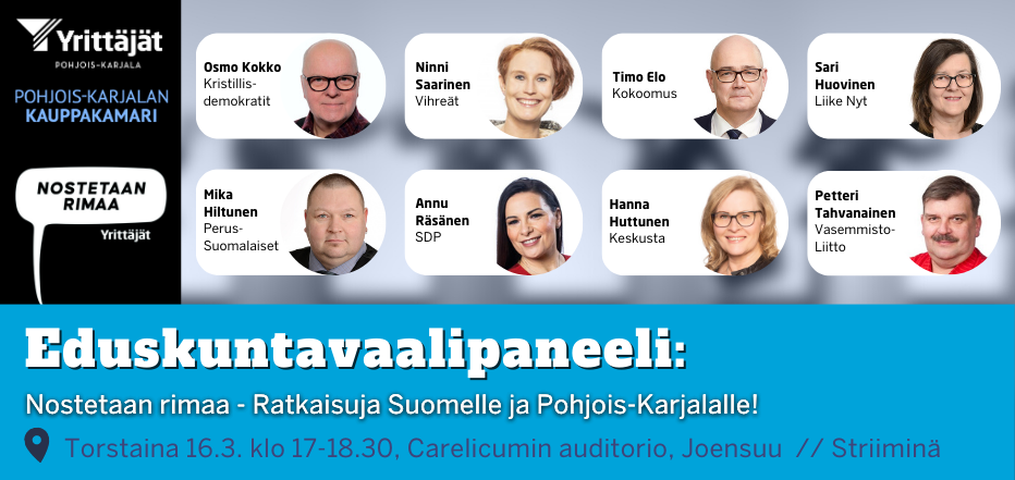 Eduskuntavaalien lähestyessä Pohjois-Karjalan elinkeinoelämän järjestöt Pohjois-Karjalan kauppakamari ja Pohjois-Karjalan Yrittäjät ry järjestävät ajankohtaisen Eduskuntavaalipaneelin hybridilähetyksenä. Olemme kutsuneet paneeliin tentattavaksemme jokaisesta puolueesta yhden ehdokkaan.