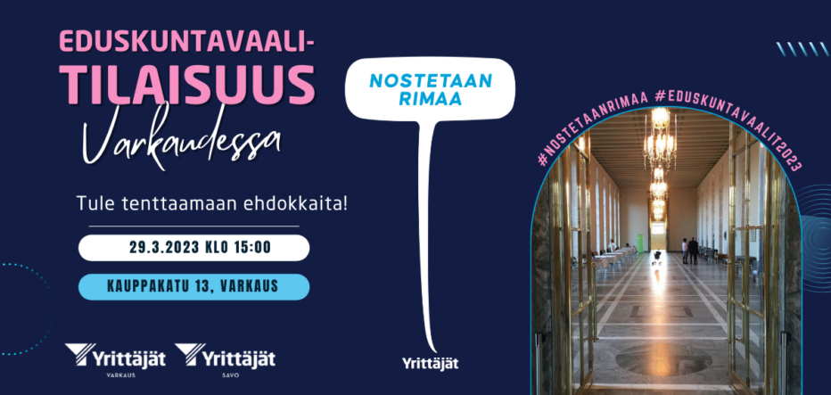 Tervetuloa eduskuntavaalitilaisuuteen keskiviikkona 29.3. Varkauden Yrittäjien toimitiloihin (Kauppakatu 13, Varkaus) klo 15:00 alkaen. Tämä on ainutlaatuinen tilaisuus päästä tutustumaan ehdokkaisiin, sekä kuulemaan heidän näkemyksiään Suomen tulevaisuudesta. Tapahtuma tarjoaa mahdollisuuden esittää kysymyksiä, jakaa ajatuksia ja verkostoitua muiden kanssa. Tervetuloa mukaan vaikuttamaan!