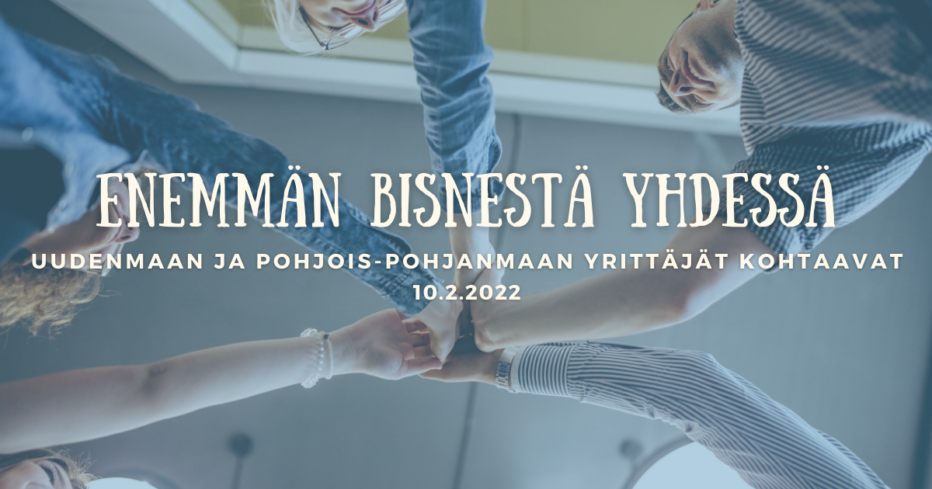 Tule mukaan Enemmän bisnestä yhdessä -yritystreffeille ja laajenna verkostoasi! Enemmän bisnestä yhdessä on Uudenmaan Yrittäjien sekä Pohjois-Pohjanmaan Yrittäjien järjestämä verkostoitumistapahtuma. Se on tarkoitettu kaikille yrittäjille toimialasta, -paikasta ja yrityskoosta riippumatta. Tapahtuma järjestetään täysin etänä verkon välityksellä.