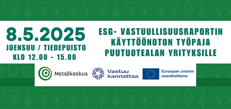 Lähde mukaan käynnistämään ESG-vastuullisuusraportointia puutuotealan pk-yrityksille! Tässä maksuttomassa työpajassa yritykset saavat käyttöönsä mallipohjan sekä asiantuntijaneuvontaa oman vastuullisuusraportoinnin aloittamiseen VSME-standardin pohjalta.