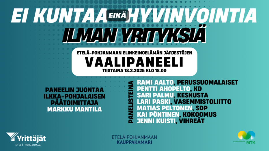 Tervetuloa seuraamaan Etelä-Pohjanmaan Yrittäjien, Etelä-Pohjanmaan Kauppakamarin ja MTK Etelä-Pohjanmaan yhteistä vaalipaneelia teemalla ”Ei kuntaa eikä hyvinvointia ilman yrityksiä”!