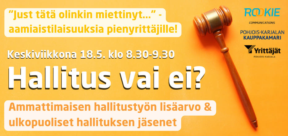 Hallitus vai ei – mitä lisäarvoa ammattimainen hallitustyö tuo mikroyritykselle ja milloin kannattaa harkita ulkopuolisia jäseniä? Mikro- ja yksinyrittäjät, tulkaahan aamiaiselle oppimaan, juttelemaan ja verkostoitumaan!