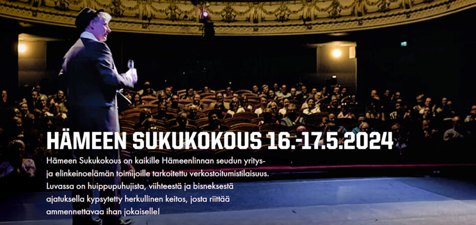 – Hämeen Sukukokous on odotettu yritystapahtuma ja ilmoittautuminen on käynyt jälleen vilkkaana. Mukana kahden päivän seminaarissa on noin 250 osallistujaa. Hämeen Sukukokouksen teemana on tänä vuonna rohkeasti, räväkästi ja rivakasti eteenpäin. Mukana on yllätyksiä, huippupuhujia, viihdettä ja verkostoitumista alueen yritys- ja elinkeinoelämän toimijoiden kesken.