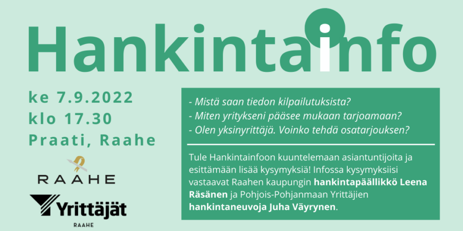 Hankintainfo on vuorovaikutteinen tilaisuus sinulle, joka toimit yrittäjänä Raahen seutukunnassa.