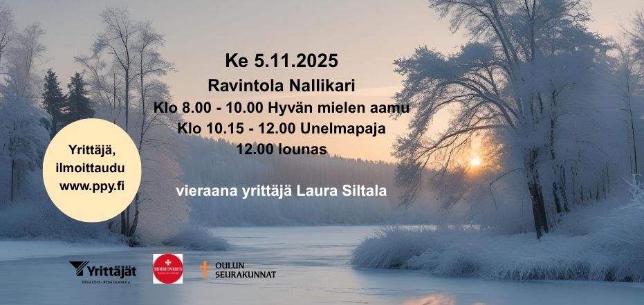 Yrittäjä, varaa aamu itsellesi ja tule mukaan rauhoittumaan ja unelmoimaan pimeän ajan keskellä. Aamu aloitetaan Hyvän mielen aamulla, tauon jälkeen jatketaan Unelmapajalla ja lopuksi nautitaan yhteinen lounas klo 12.00. Voit osallistua vain toiseen tai molempiin tilaisuuksiin.