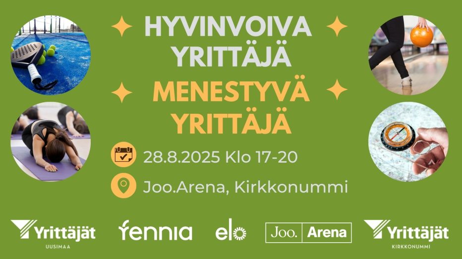 Tule viettämään yrittäjien rentoa iltaa hyvinvoinnin merkeissä Joo.Arenalle Kirkkonummelle. Nauti ravintola Ceitaan herkuista ja osallistu selän hyvinvoinnin luennolle sekä yrittäjän keskustelevaan hyvinvointityöpajaan. Valitse sinua inspiroiva lajikokeilu ja lähde porukalla padelin, keilauksen, kehonhuollon tai suunnistuksen ohjatulle tunnille.