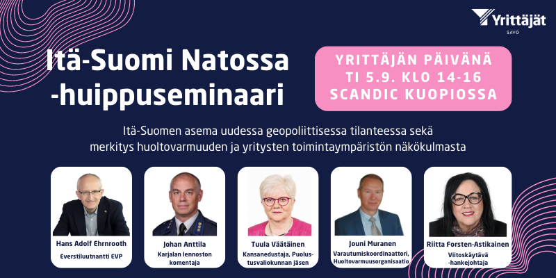 Tervetuloa syksyn tärkeimpään turvallisuuspoliittiseen seminaariin. Savon Yrittäjät järjestää Yrittäjän päivänä yleisötilaisuuden, jossa aiheena on Itä-Suomen asema uudessa turvallisuuspoliittisessa tilanteessa. Kuuntele huippuasiantuntijoiden alustuksia, paneelikeskustelua ja osallistu keskusteluun. Voit esittää kysymyksiä luennoitsijoille myös etukäteen tomi.kosonen@yrittajat.fi