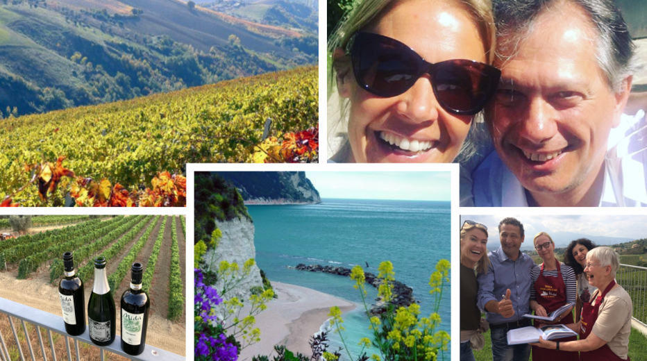 - Pastaruoka ja herkullinen tuhti munakoisovuoka, viinit ovat marchelaiselta luomuviinitilalta