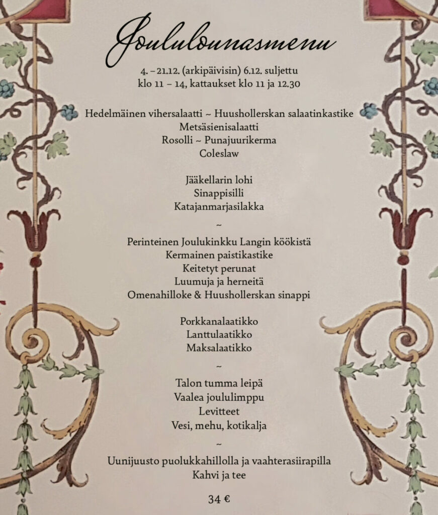 Varaus on klo 11 kattaukselle ja paikkoja on rajoitetusti. Joululounaalle tuleekin ilmoittautua etukäteen oheisen linkin kautta viimeistään tiistaina 5.12.2023.