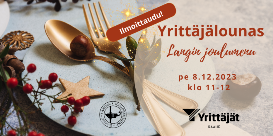 Tervetuloa yrittäjälounaalle Langin köökin herkkujen äärelle jouluisissa merkeissä! Raahen Yrittäjät tarjoaa perinteitä huokuvan jouluisen verkostoitumislounaan jäsenilleen. Tule tutustumaan pitäjän muihin yrittäjiin ja nauttimaan yhdessäolosta, kiinnostavista keskusteluista ja hyvästä ruoasta.