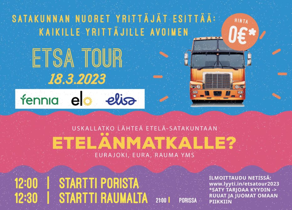 Viimesyksyinen POSA-tour saa jatkoa! Tällä kertaa tutustutaan mystiseen Etelä-Satakuntaan (Eurajoki, Eura, Rauma….) ETSA-tourin merkeissä. Yritysvierailukohteita emme etukäteen paljasta, vaan lähde rohkeasti mukaan ”sokkobussimatkalle”, hyppää mukaan kyytiin jos uskallat! Tarjolla päivän aikana on taatusti hyvää seuraa, verkostoitumista, mielenkiintoisia yritysvierailuja sekä ruokaa ja juomaa.