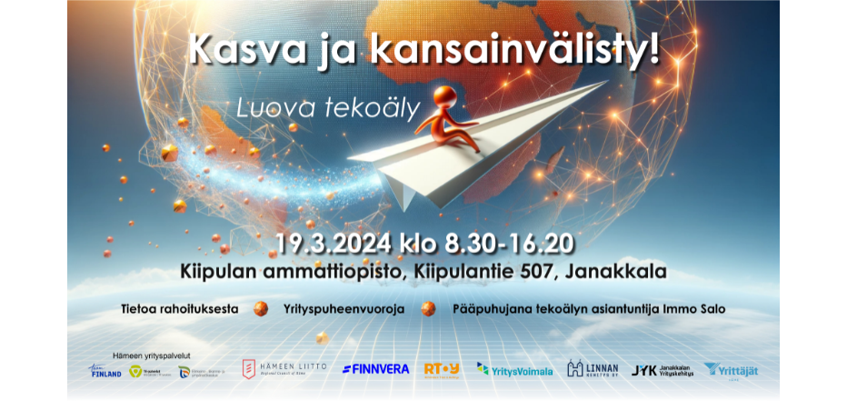 Kanta-Hämeen suurin kasvu- ja kansainvälistymistapahtuma kokoaa yrityksiä ja kansainvälistymispalveluja tarjoavia toimijoita yhteen jo 12. kerran. Tapahtuma järjestetään 19.3.2024 klo 8.00 – 16.20 Janakkalassa, Kiipulan ammattiopisto, Kiipulantie 507, 14200 Turenki.