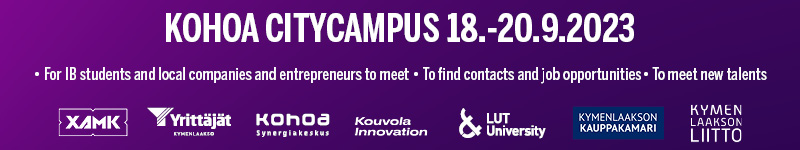 Kohoa Citycampus is organised in cooperation with South-Eastern Finland University of Applied Sciences XAMK, the Kouvola unit of the LUT University, Kouvola Innovation Oy, Kymenlaakso Chamber of Commerce, Kohoa Synergy Center and The Regional Association of Entrepreneurs in Kymenlaakso.