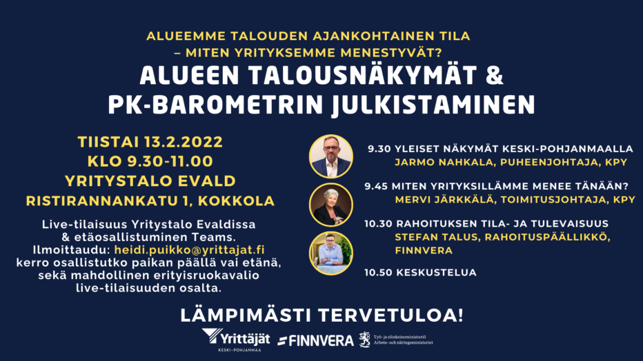 Lämpimästi tervetuloa Keski-Pohjanmaan alueen talousnäkymien sekä PK-barometrin julkistamistilaisuuteen tiistaina 13.2. klo 9.30-11.00 Yritystalo Evaldiin tai teamsin välityksellä.
