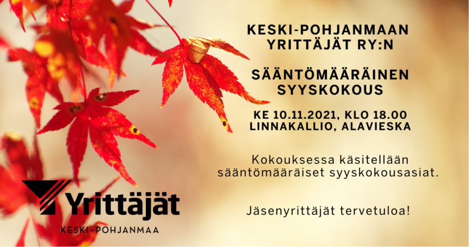 Keski-Pohjanmaan Yrittäjät ry:n sääntömääräinen syyskokous. Kokouksen alussa tarksitamme valtakirjat. Kaikki jäsenyrittäjät tervetuloa.