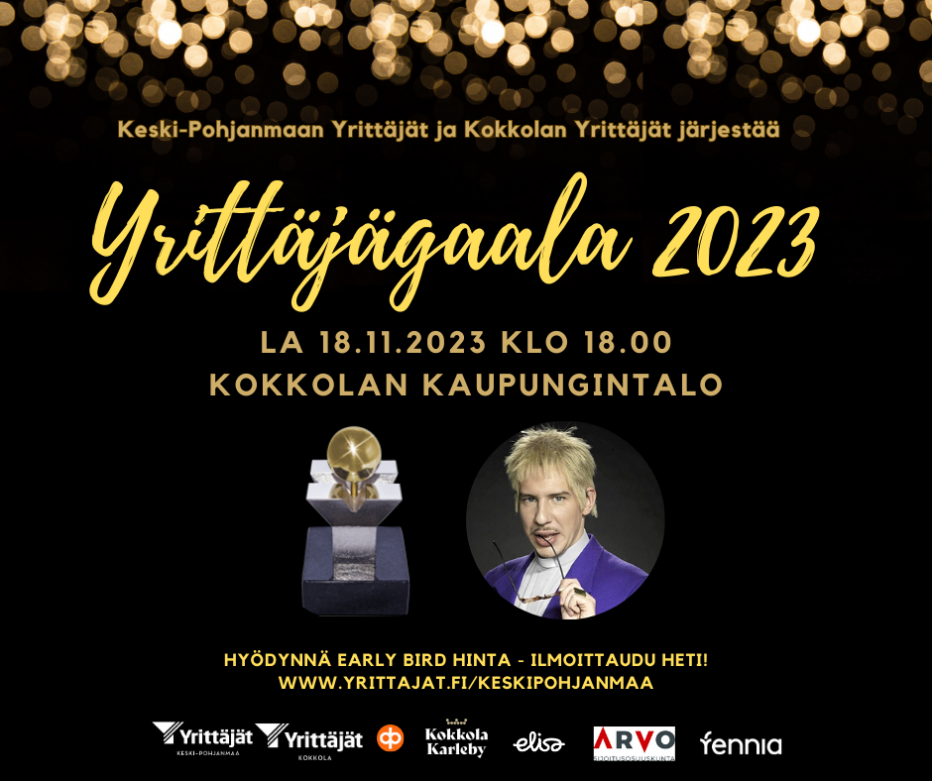Keski-Pohjanmaan Yrittäjät järjestää yhdessä Kokkolan Yrittäjien sekä muiden yhteistyökumppanien kanssa, vuoden 2023 Yrittäjägaalaan. Tilaisuuteen ovat tervetulleita alueen kaikki yrittäjät, kunta- ja aluepäättäjät sekä yhteistyökumppanit. Illan aikana kuulemme mielenkiintoisista puheenvuoroja, palkitsemme vuoden yrittäjiä, nautimme herkullisesta buffetista, sekä vietämme iltaa iloisissa tunnelmissa! Tilaisuus järjestetään Kokkolan kaupungintalolla.