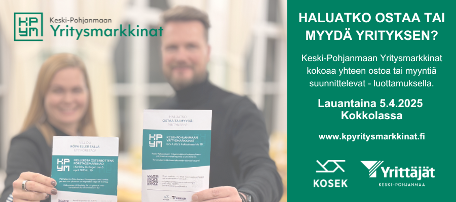 Keski-Pohjanmaan Yritysmarkkinat kokoaa yhteen yrityksen ostoa tai myyntiä suunnittelevat lauantaina 5.4.2025 Kokkolassa. Ilmoittaudu mukaan 27.3.2025 mennessä.