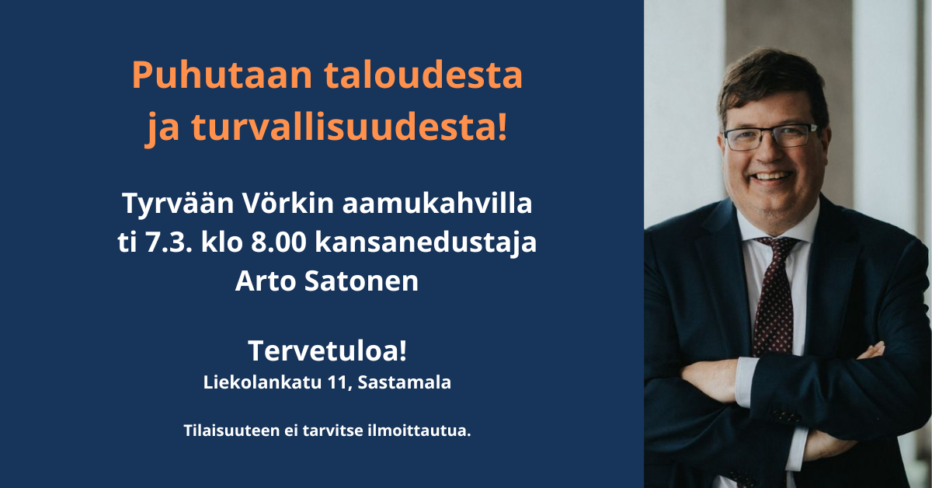 Tervetuloa keskustelemaan kansanedustaja Arto Satosen kanssa ajankohtaisista asioista talouden ja turvallisuuden näkökulmasta. Ei erillistä ilmoittautumista.