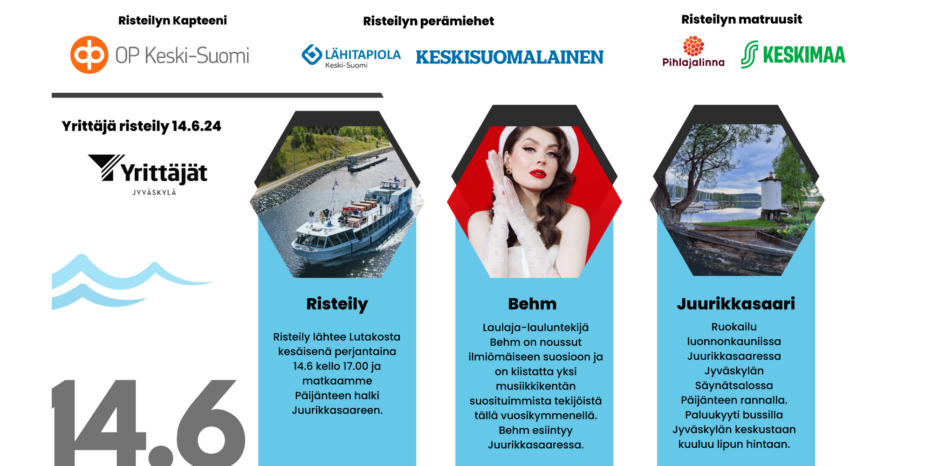 Tule mukaan kanssamme laineille nauttimaan ihanasta kesäillasta, yhdessäolosta sekä loistavasta musiikista. Kevätkauden päätösristeily järjestetään tänä vuonna poikkeuksellisesti risteilynä Juurikkasaareen, joka juhlii 20-vuotista yrittäjätaivaltaan.