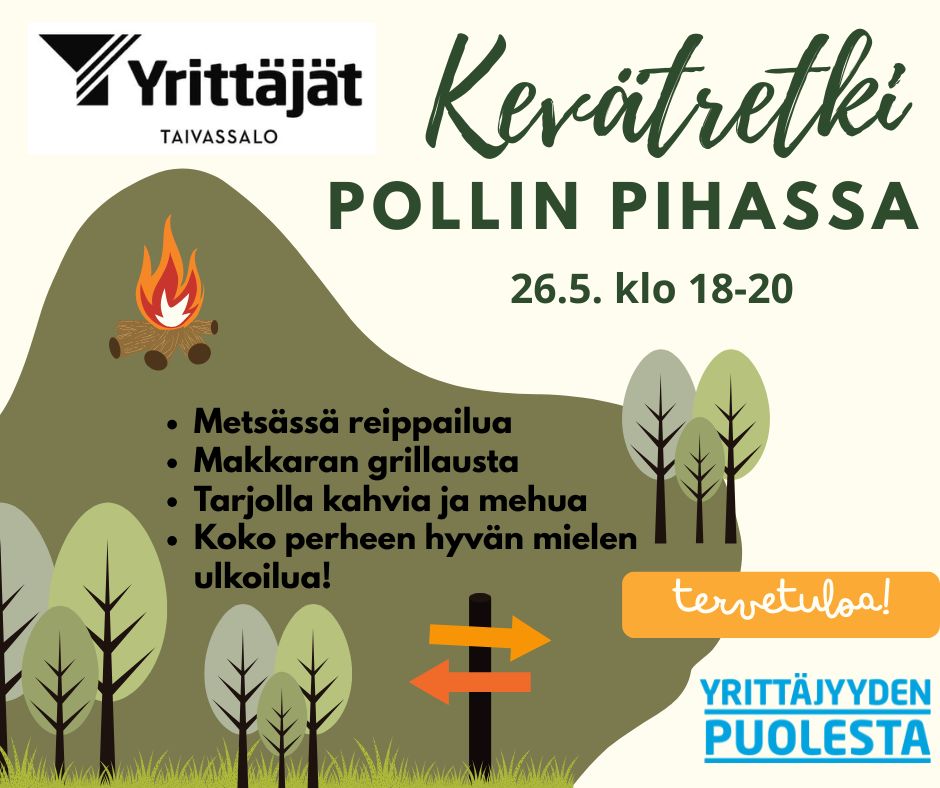 Tervetuloa nauttimaan raittiista ilmasta, paistamaan makkaraa ja kahvittelemaan vaikka koko perheen voimin Pollin Pihaan 26.5. klo 18-20. Mukaan tarvitset vain ulkoiluun sopivat vaatteet. Tapahtuma soveltuu hyvin myös lapsille.