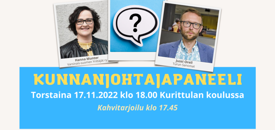 Kunnanjohtajapaneeliin on kutsuttu valintaprosessissa loppusuoralle päässeet: Nousiaisten kunnanjohtaja Teemu Heinonen, Raision talousjohtaja Sanna Häkli, Vaalan kunnanjohtaja Miira Raiskila ja Maskun talous- ja henkilöstöjohtaja Jenni Sipilä.Heiltä kuullaan vastauksia ajankohtaisiin asioihin Kurittulan koulusssa torstaina 17.11.2022 klo 18:00 alkaen.