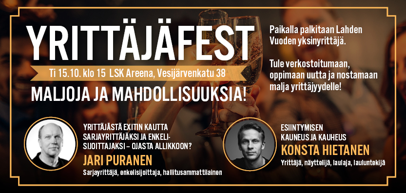 Katkaise työpäiväsi tiistaina 15.10. hieman aiemmin, ja suuntaa tiesi Lahden keskustaan LSK Areenan tiloihin klo 15. Tässä lokakuun festissä olut vaihdetaan kuohuviiniin ja kansallispuvut smart casualiin. LSK Areenalla nautitaan rennosta verkostoitumisesta, inspiroivista puheenvuoroista, sekä juhlistetaan Lahden Vuoden yksinyrittäjää.