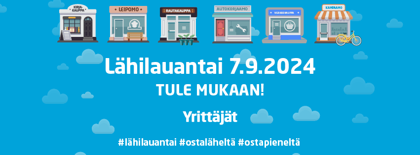 Syyskuun alussa vietetään taas valtakunnallista Lähilauantaita. Päivän tarkoitus on tukea paikallista yrittäjyyttä ja muistuttaa siitä, miten tärkeää on, että oman kotikunnan tai -kaupungin tarjolla olevat palvelut säilyvät lähellä myös tulevaisuudessa. Lauantaina 7.9. laitetaan siis ostohousut jalkaan, ovipumput laulamaan ja kassakoneet kilisemään ja suunnataan ostoksille lähiseudun pieniin yrityksiin.