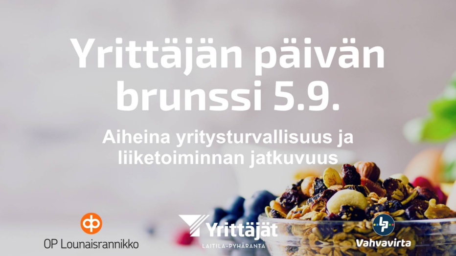 Tervetuloa juhlistamaan Yrittäjän päivää torstaina 5.9. kello 8 Juhlatalo Sirppuun (Erik Sorolaisentie 15, Laitila). Leppoisan brunssin lomassa pureudumme myös hyödylliseen aiheeseen "Yritysturvallisuus ja liiketoiminnan jatkuvuus".