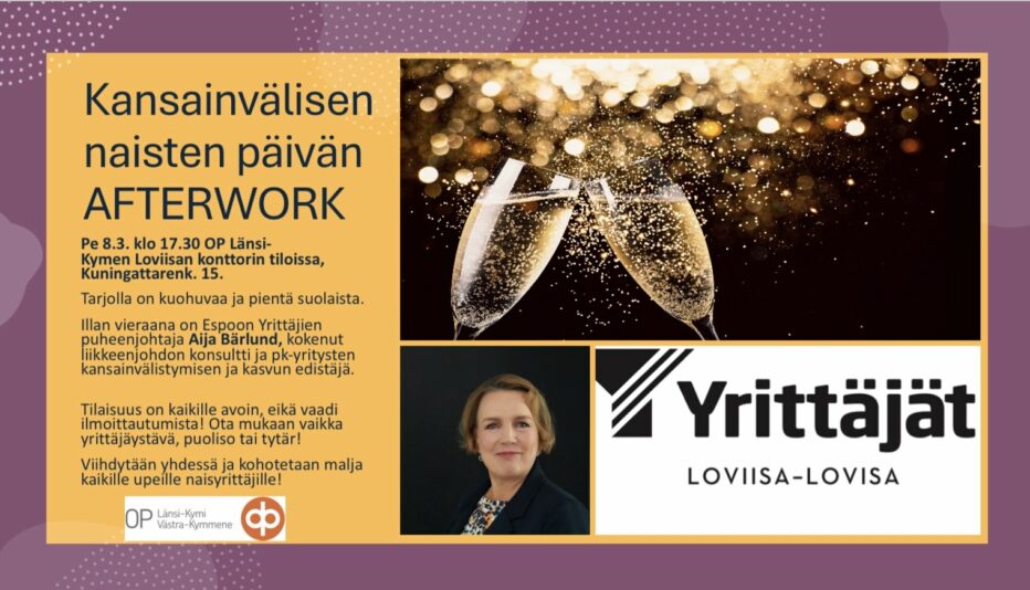 Kansainvälisen naisten päivän Afterworks pe 8.3. klo 17.30 Länsi-Kymen OP-pankin tiloissa nostamme maljan naisyrittäjille. Tarjolla kuohuvaa, pientä suolaista. Illan vieraana Espoon Yrittäjien puheenjohtaja Aija Bärlund.