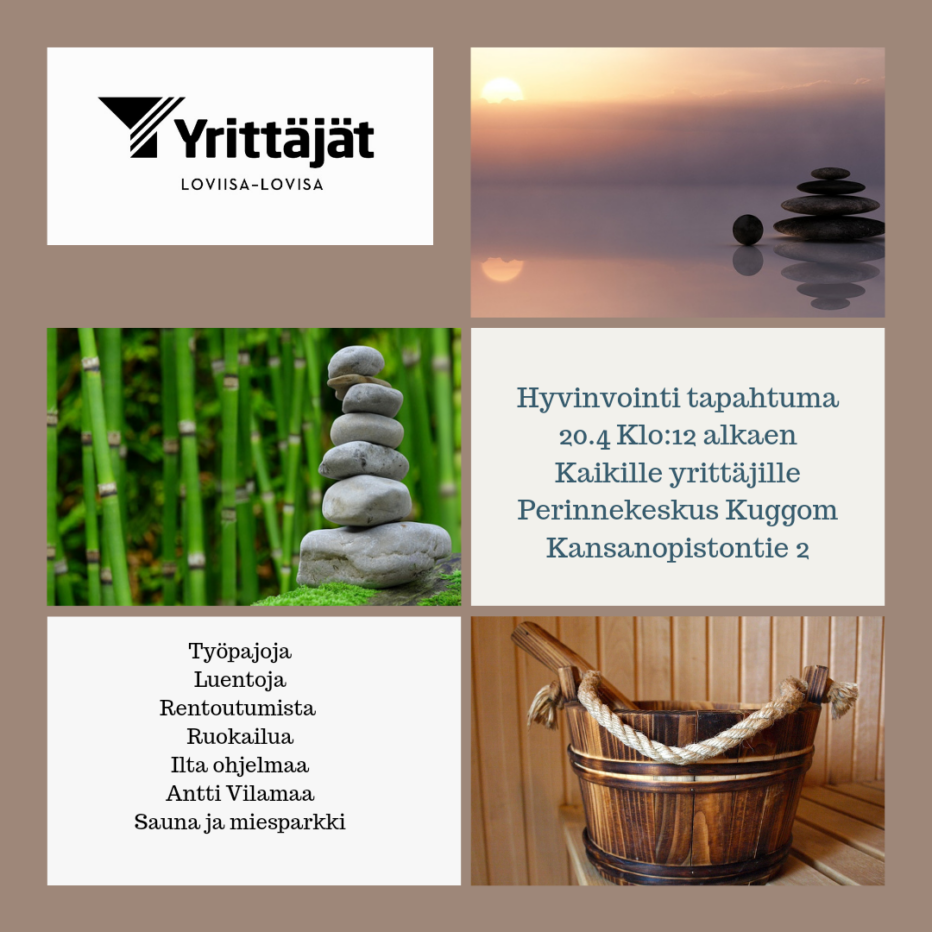 Tervetuloa! (ilmoittautuminen viimeistään 15.4.). Hyvinvointitapahtuma on avoin muillekin kuin Loviisan Yrittäjät ry:n jäsenille, maksuton yrittäjille.