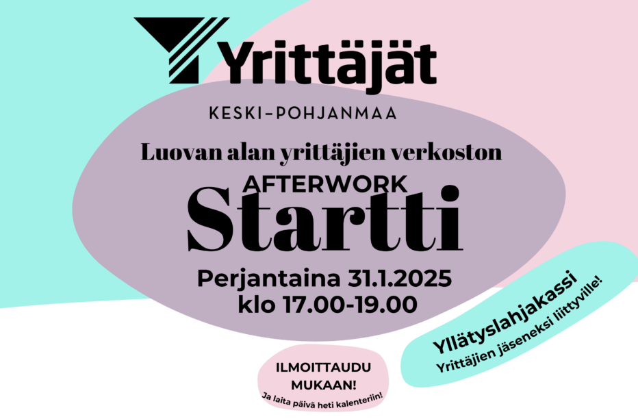 Kutsumme kaikki luovan alan yrittäjät ja sellaiseksi itsensä koskevat, yhteisille afterworkeille ja verkoston starttitapahtumaan, tapaamaan muita Keski-Pohjanmaan Yrittäjien luovan alan yrittäjiä. Afterworkia luotsaa Kuulumon Anni-Veera Aitolehti sekä Keski-Pohjanmaan Yrittäjien toimitusjohtaja Anna Kotamäki.