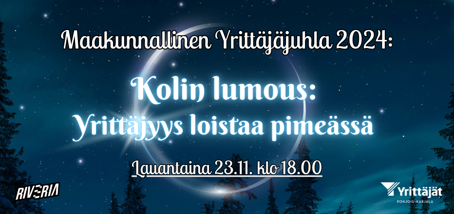 Tervetuloa mukaan vuoden suurimpaan yrittäjäjuhlaan Kolin huipulle kokemaan, kuinka yrittäjyys loistaa kirkkaasti marraskuun pimeydessä! Tämä ainutlaatuisen tähdekäs ilta kokoaa pohjoiskarjalaiset yrittäjät yhteen juhlistamaan saavutuksiaan ja toisiaan. Tule nauttimaan Kolin huipun mahtavista maisemista, tähtitaivaallisesta lumouksesta sekä maagisesta kansallisympäristöstä.