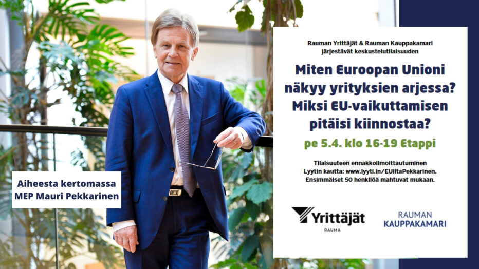 Tilaisuudessa aiheesta puhumassa MEP, pitkän linjan poliitikko Mauri Pekkarinen.