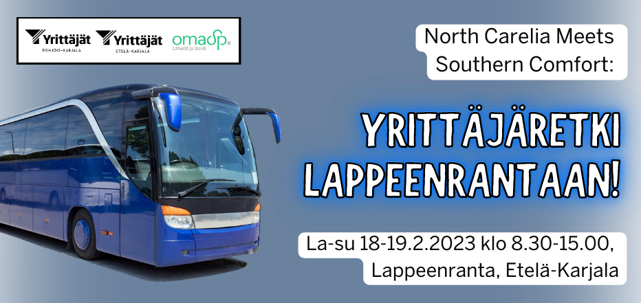 Yrittäjäretken tarjoaa OmaSp, Etelä-Karjalan Yrittäjät, Pohjois-Karjalan Nuoret Yrittäjät, Pohjois-Karjalan Yrittäjät. Ilmoittaudu mukaan yrittäjäreissulle ja tule toteamaan Lappeenrannan lumo sekä vieraanvaraisuus! Huom – paikkoja matkalle on 40 ensimmäiselle. Tervetulleita ovat kaikki yrittäjät ikään katsomatta. Lisätiedot p. 050 448 8468 ja joonas.hiltunen@yrittajat.fi.