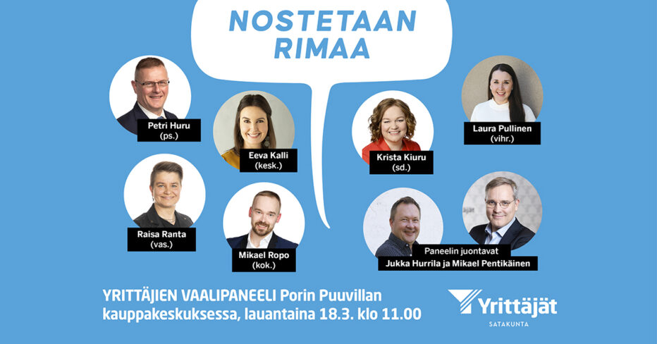 Tulossa on mielenkiintoinen vaalipaneeli klo 11.00 alkaen Puuvillan kauppakeskuksen tapahtuma-aukion lavalla, jonka juontavat Suomen Yrittäjien toimitusjohtaja Mikael Pentikäinen ja Satakunnan Yrittäjien puheenjohtaja Jukka Hurrila. Panelisteina: Petri Huru (PS), Eeva Kalli (KESK), Krista Kiuru (SDP), Laura Pullinen (VIHR), Raisa Ranta (VAS) ja Mikael Ropo (KOK).