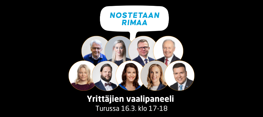 To 16.3. klo 17 Yrittäjien vaalipaneelissa Turussa keskustelemassa ovat Petteri Orpo (kok), Ville Tavio (ps), Aki Lindén (sd), Mauri Kontu (kesk.), Sofia Virta (vihr), Sandra Bergqvist (r.), Jarkko Wallinkoski (liik.), Katriina Hiippavuori (kd.) ja Lotta Laaksonen (vas.).