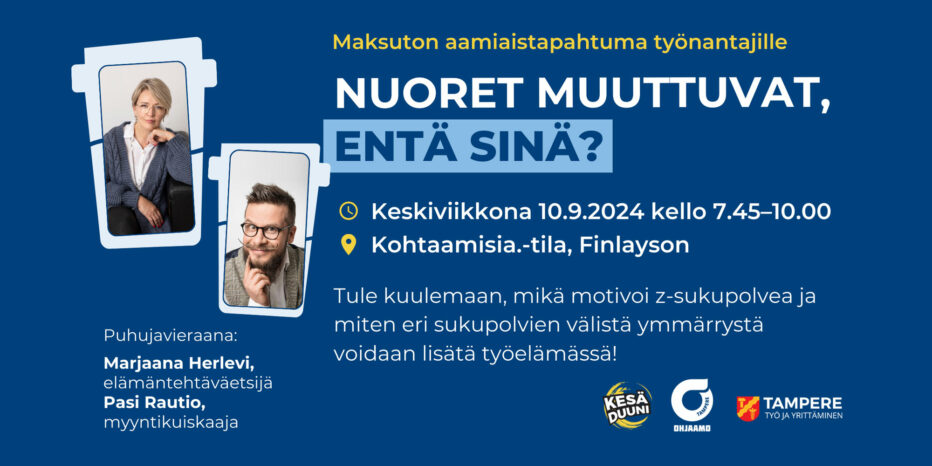 Kesäduuni-kampanja järjestää maksuttoman Nuoret muuttuvat, entä sinä? -aamiaistilaisuuden Tampereella syyskuussa. Puhujina toimivat webinaaristakin tutut motivaatiovalmentaja Marjaana Herlevi ja myyntikuiskaaja Pasi Rautio. Puheenvuoroissaan Marjaana ja Pasi avaavat miten toimia, jos työntekijöiden ja työnantajien toiveet eivät kohtaa sekä mikä motivoi nuoria ja miksi työpaikka pitää rakentaa kuin myytävä tuote. Lisätietoa löydät tapahtumasivulta.