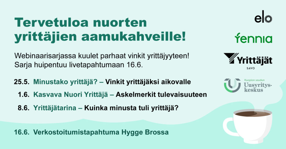 Osana nuorille yrittäjille suunnattua webinaarisarjaa järjestetään loppuhuipennuksena verkostoitumistapahtuma, jossa pääsemme livenä näkemään toisimme sekä jakamaan kokemuksiamme. Tarjolla kahvia ja aamupalaa paikalle saapuville.