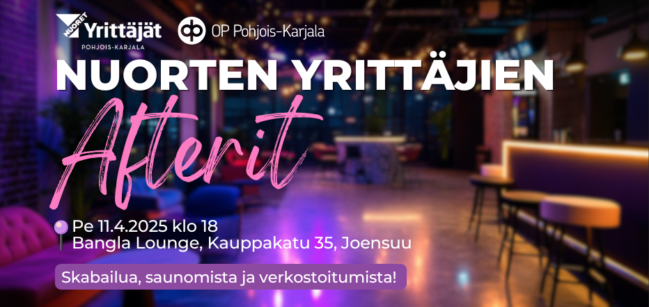 Tule mukaan rentoon iltaan Pohjois-Karjalan Nuorten Yrittäjien aftereille! Illan aikana pääset tapaamaan muita nuoria ja nuorenmielisiä yrittäjiä, verkostoitumaan ja skabailemaan mysteerirastien merkeissä! 😀