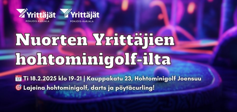 Tule mukaan Nuorten Yrittäjien rentoon hohtominigolf-iltaan, jossa pääset kisaamaan dartsissa, pöytäcurlingissa tai hohtominigolfin säihkyvillä radoilla!