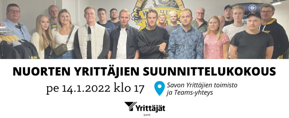 Nuorten Yrittäjien seuraava fyysinen tapaaminen on Kuopiossa perjantaina 18.2.2022 klo 17.00. Tarkempi ohjelma ja paikka ilmoitetaan lähempänä.