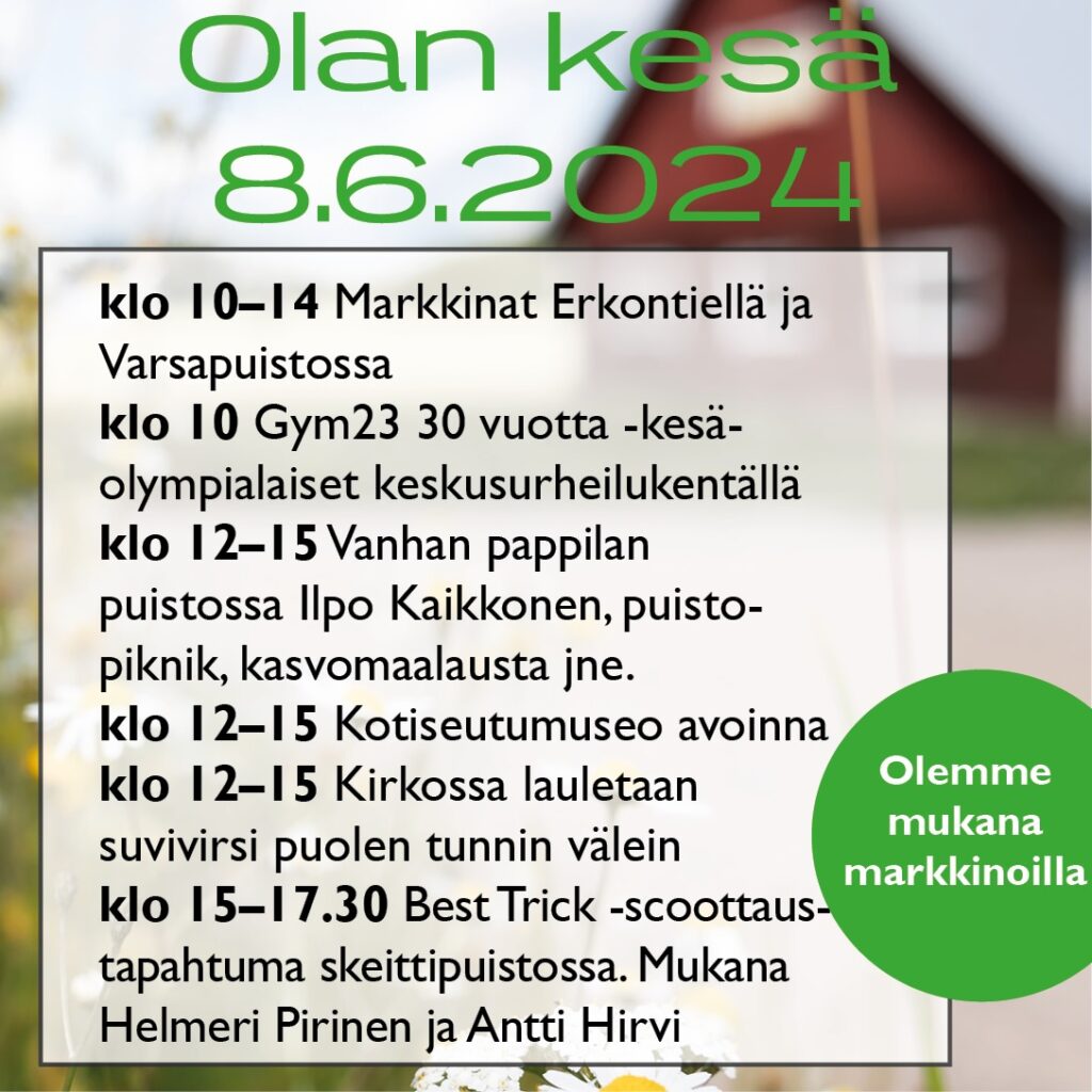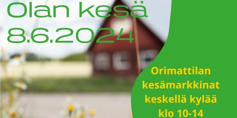 Tuolloin on tapahtumia vähän siellä ja täällä ja varsinkin keskellä kylää Orimattilassa. Kello 10-14 Olan kesämarkkinat valtaavat Orimatin sekä Säästöpankin ja Osuuspankin talojen edustat ja lisäksi myös Varsapuiston. Markkinoilla on mukana reilu 50 paikallista yritystä ja yhdistystä esittelemässä toimintaansa tai/sekä esittelemässä tuotteitaan. Myrskylän Säästöpankki tarjoaa markkinakahvit! Klo 10.30 ja 11.30 Tommi Tuomisen stand up-keikka lähellä kaupungintaloa olevalla rekkalavalla. Paikallinen The Old Sisuteam-bändi viihdyttää markkinakansaa samaisella lavalla klo 11 ja 13.