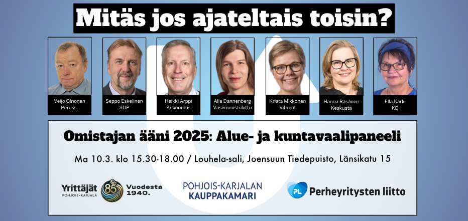Vaalien lähestyessä Pohjois-Karjalan kauppakamari, Perheyritysten liitto ja Pohjois-Karjalan Yrittäjät ry järjestävät ajankohtaisen vaalipaneelin. Omistajan ääni – kasvua ja elinvoimaa! -kiertue 2025 kokoaa yhteisiin keskusteluihin päättäjät, yritykset ja paikalliset toimijat ennen kunta- ja aluevaaleja. Tule paneeliin kuulemaan etänä tai livenä, kuinka eduskuntavaaleissa viedään yrittäjyyttä eteenpäin.