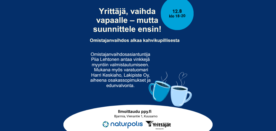 Tämä ilta tarjoaa käytännönläheisiä neuvoja ja ajankohtaista tietoa kaikille yrittäjille – jokainen yritys vaihtaa omistajaa jossain vaiheessa.