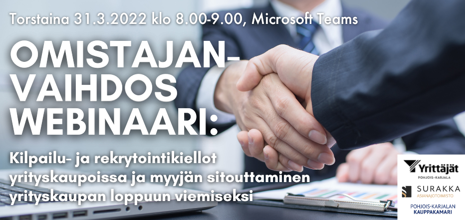 Webinaarin tarjoaa Pohjois-Karjalan Yrittäjät ry, Pohjois-Karjalan Kauppakamari ry sekä Asianajotoimisto Surakka Oy. Tapahtuma on maksuton ja kaikille avoin. Lisätiedot joonas.hiltunen@yrittajat.fi, p. 050 448 8468.