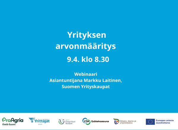 Tervetuloa osallistumaan Yrityksen arvonmääritys -webinaariin, joka järjestetään 9. huhtikuuta klo 8.30. Webinaarissa asiantuntijana toimii Markku Laitinen Suomen Yrityskaupat Oy:stä.