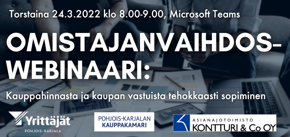 Webinaarin tarjoaa Pohjois-Karjalan Yrittäjät ry, Pohjois-Karjalan Kauppakamari ry sekä Asianajotoimisto Kontturi & Co Oy. Tapahtuma on maksuton ja kaikille avoin.
