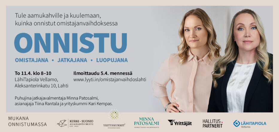 Tule aamukahville ja kuuntelemaan, kuinka hoidat omistajanvaihdoksen (omistajana, jatkajana ja luopujana) onnistujana!