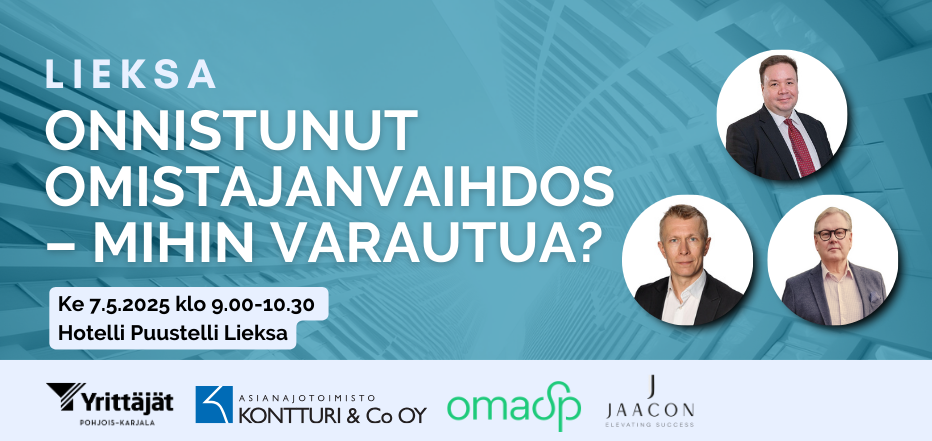 Onko aika luopua yrityksestäsi? Vai etsitkö jatkajaa toiminnallesi? Tule kuulemaan, miten onnistunut omistajanvaihdos tehdään sujuvasti ja kannattavasti.
