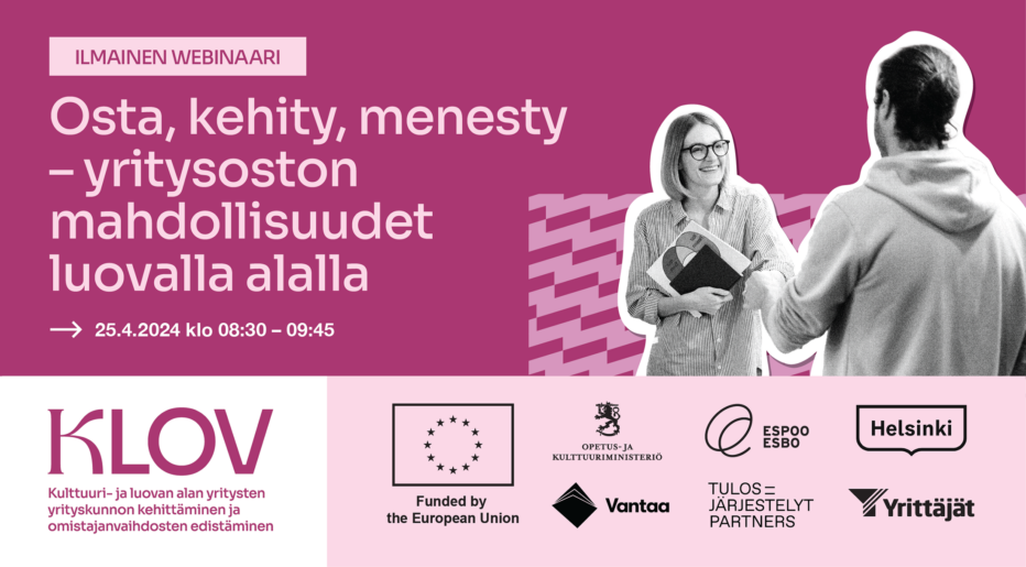 Webinaari on osa KLOV-hanketta, jossa järjestetään pilottiohjelma kulttuuri- ja luovan alan yritysten kehittämiseksi.
